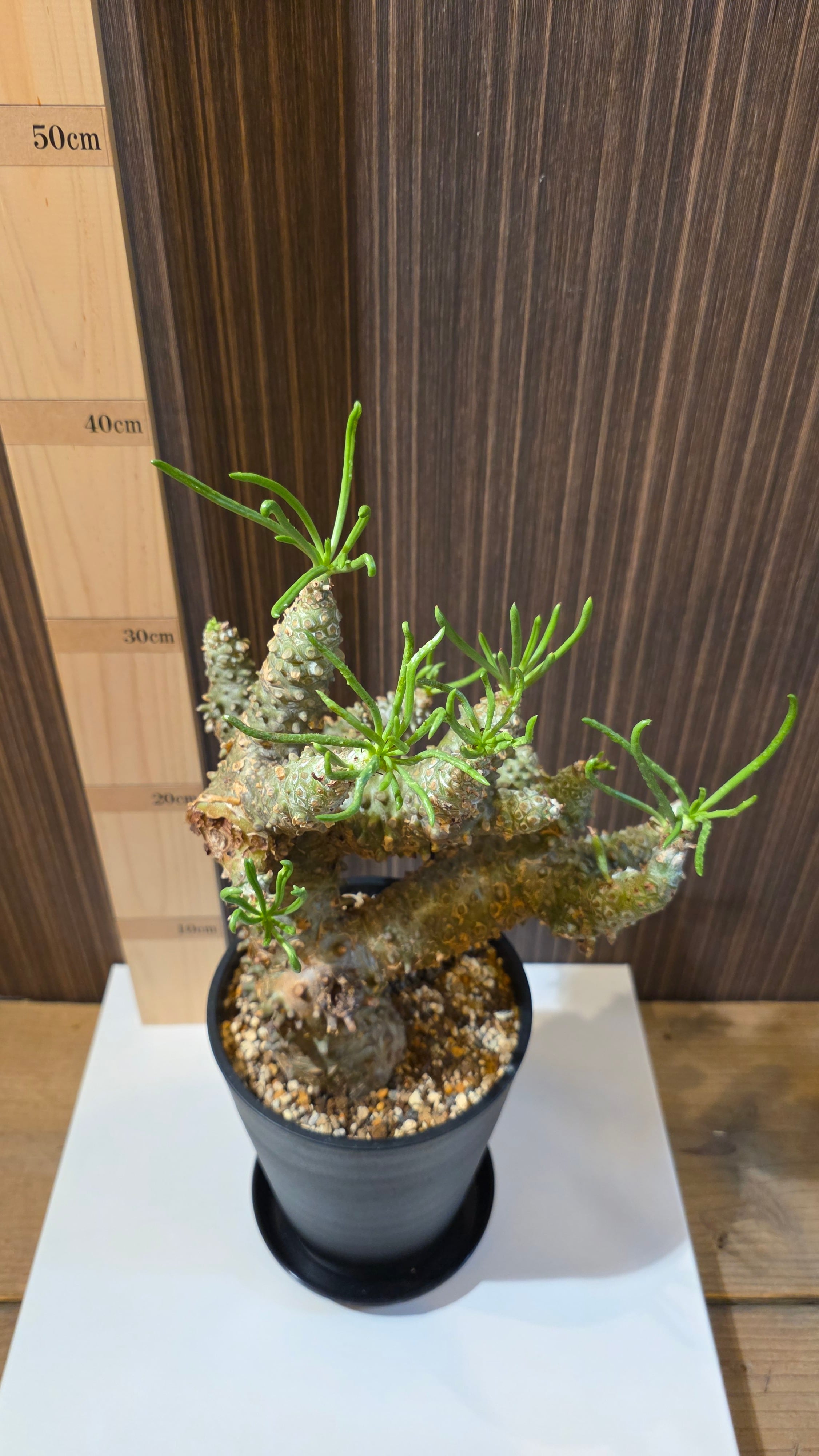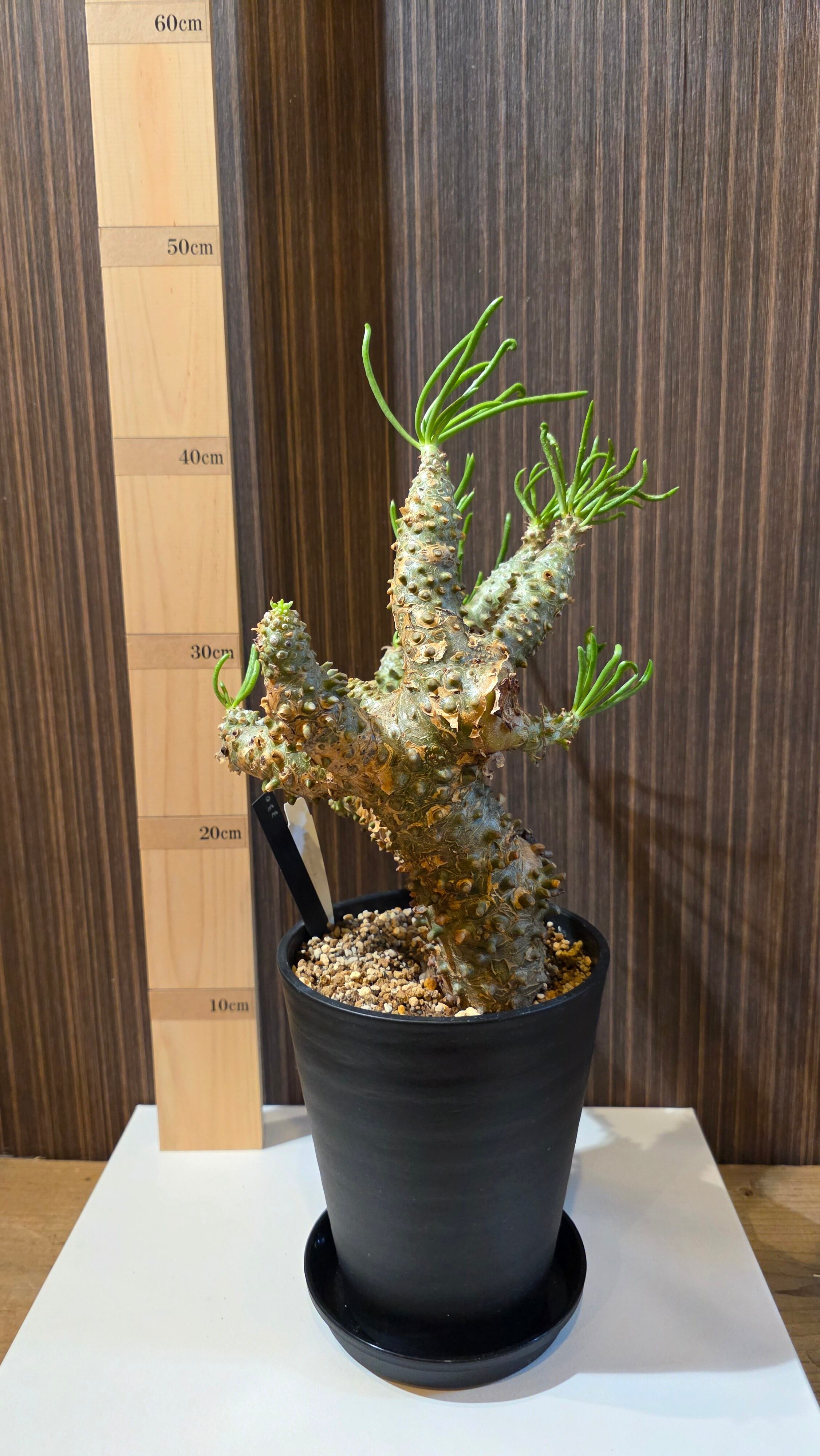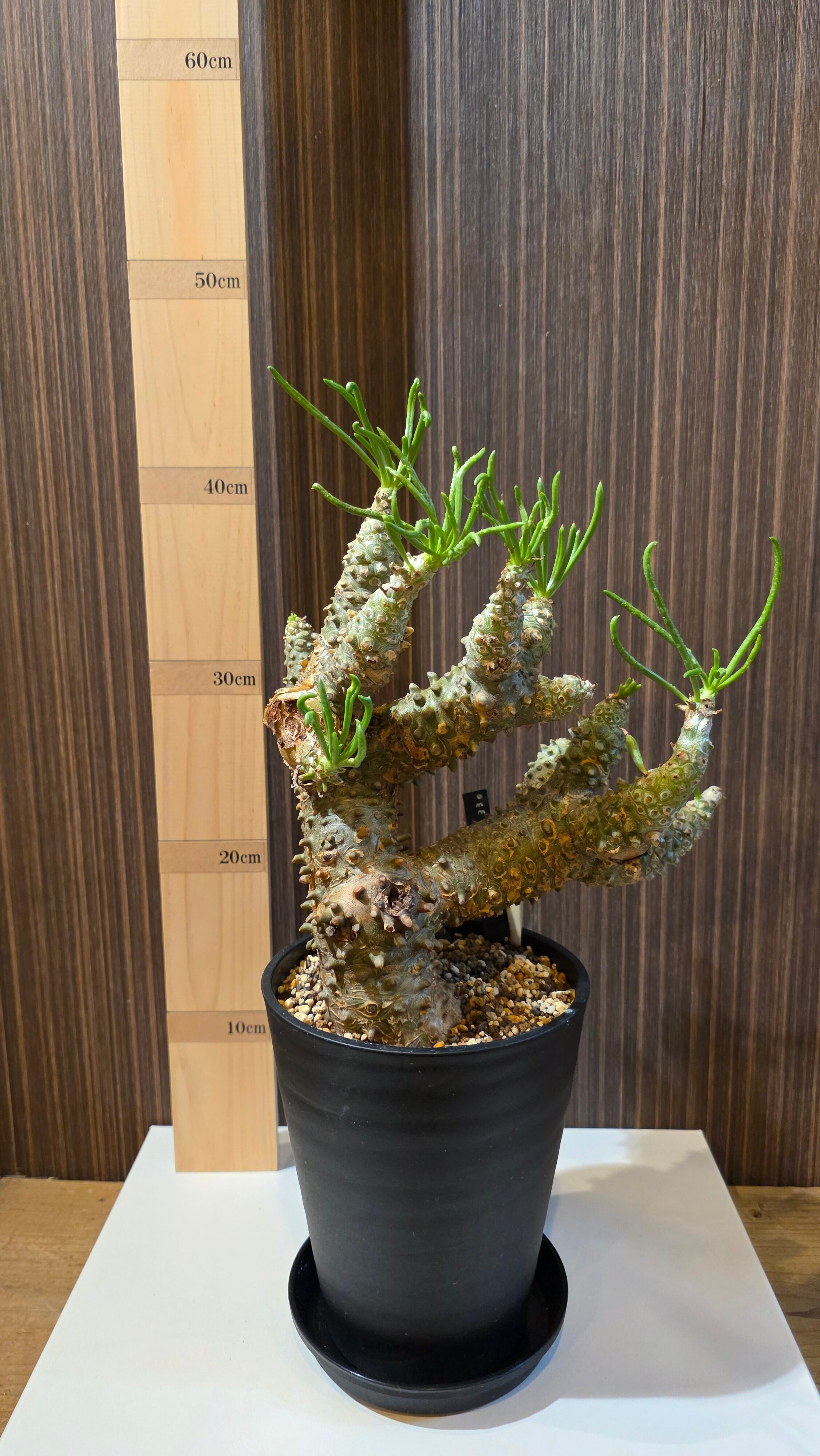 草姿: 太くしっかりとした主幹から枝が分岐し、ごつごつとした突起が特徴的な外観を持ちます。シルバーがかった肌色をしています。
