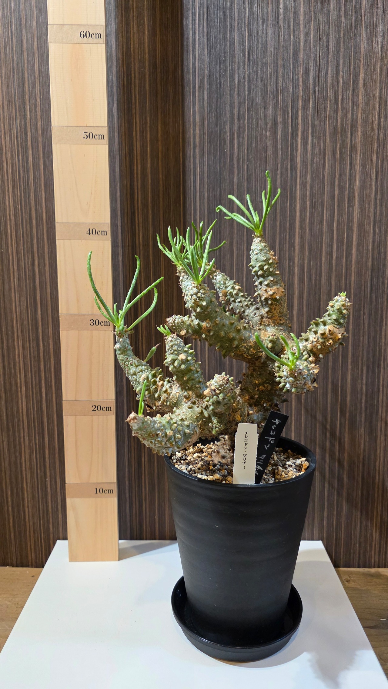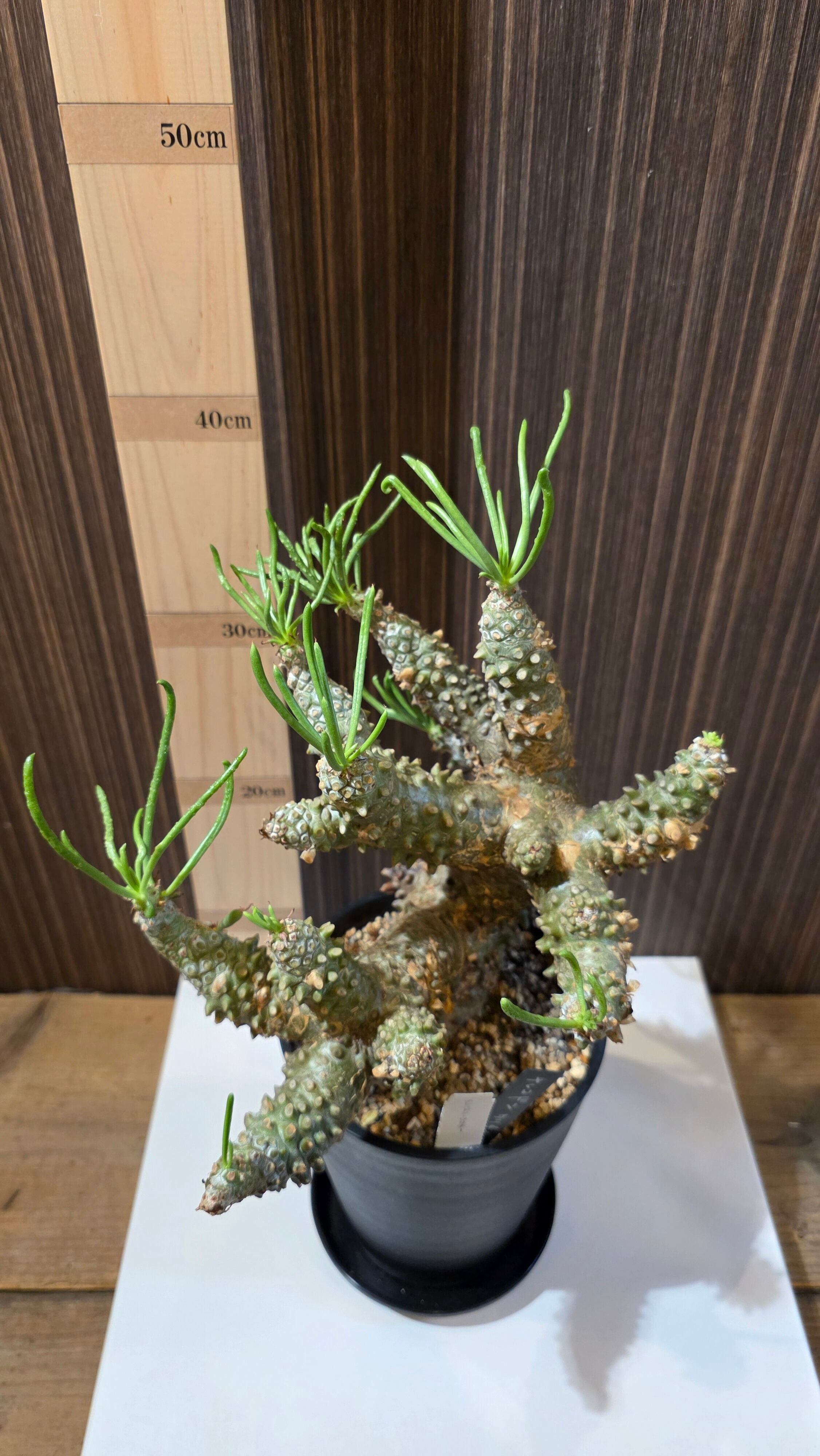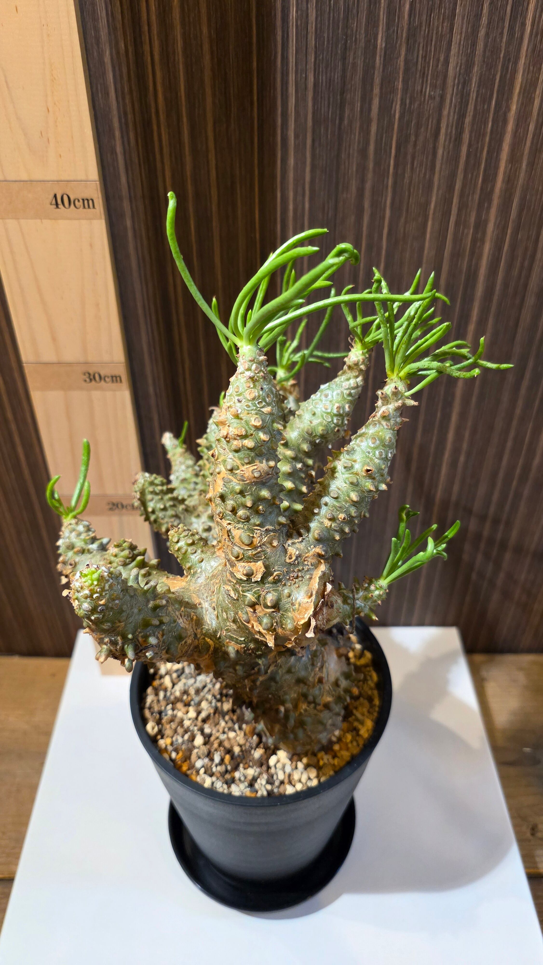 草姿: 太くしっかりとした主幹から枝が分岐し、ごつごつとした突起が特徴的な外観を持ちます。シルバーがかった肌色をしています。