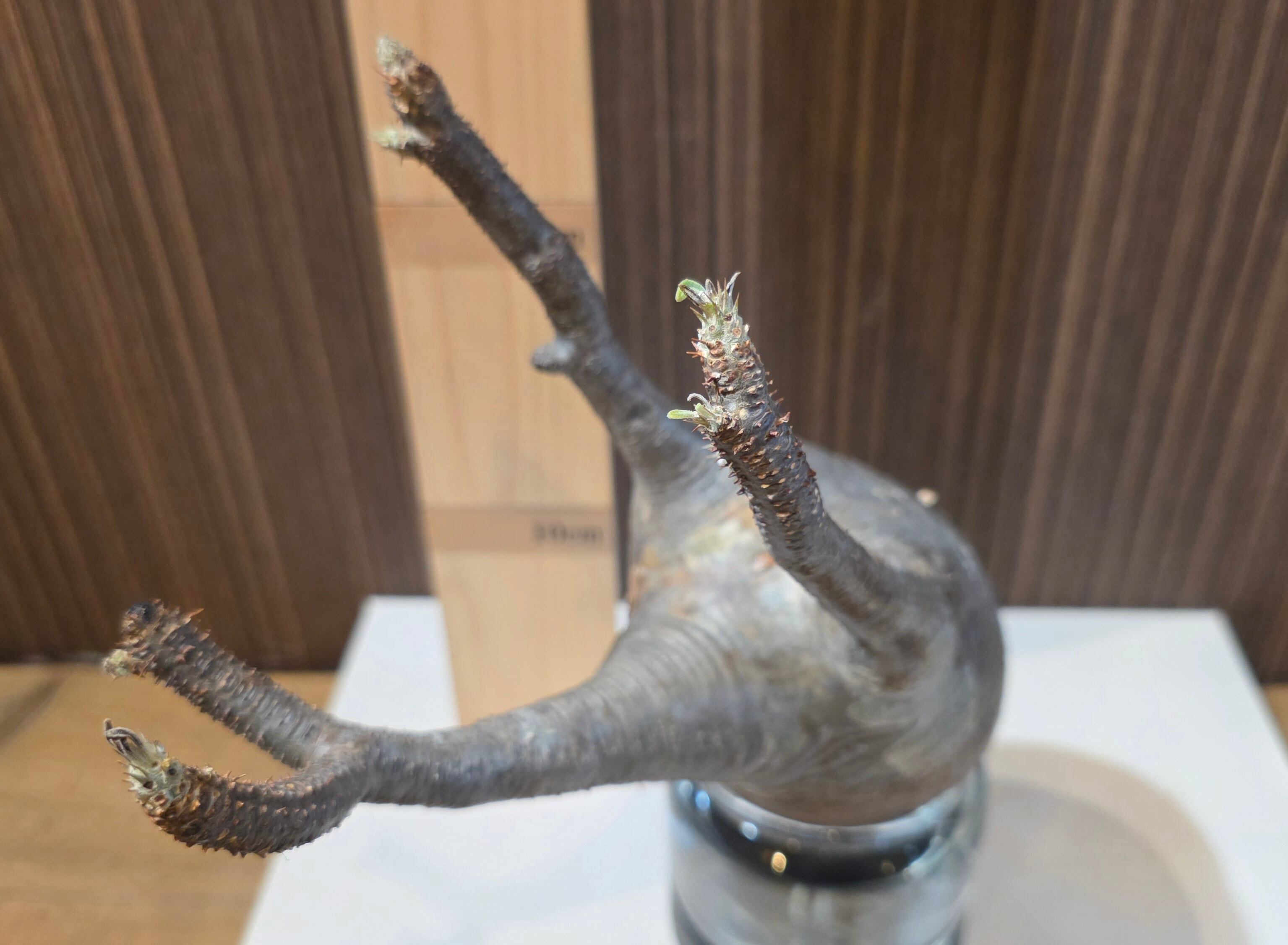 草姿: 太い幹が特徴で、上部にはワイヤーのように曲がった若芽が放射状に広がります。その見た目は、まるでアートのようです。
